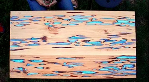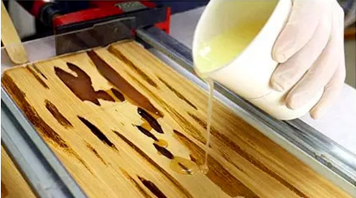 三、然后我們把木板四周用塑料板固定好,把調(diào)配好顏色的AB膠水,澆到孔洞縫隙里面,等它干了以后就大功告成了。